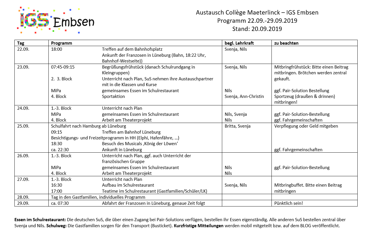 Aktualisiertes Programm vom 20.09. - Treffzeit am Ankunftstag aktualisiert
